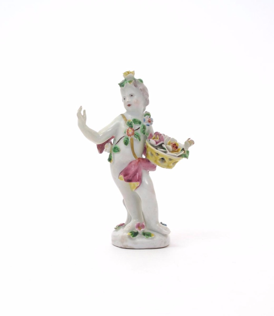 A rare Samuel Gilbody (Liverpool) figure of Spring c.1756-60, modelled as a putto holding a basket of flowers in his left arm and further draped in a floral garland, the low base applied with small flowers, some restoration, 12.5cm.
