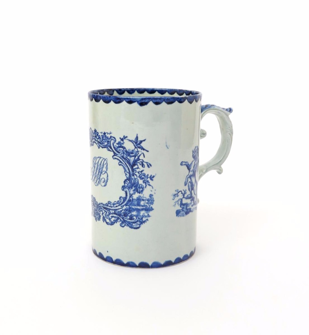 A rare and large John Pennington (Liverpool) blue and white mug c.1779, printed with an elaborate scrolling cartouche, the top corners with birds perched atop, the bottom left corner with a ship mast behind boxes, the right with ducks swimming before a tower, the centre containing the monogrammed initials JMB, either side of the cartouche decorated with a lion rampant, a long restored crack, 21.3cm high.
