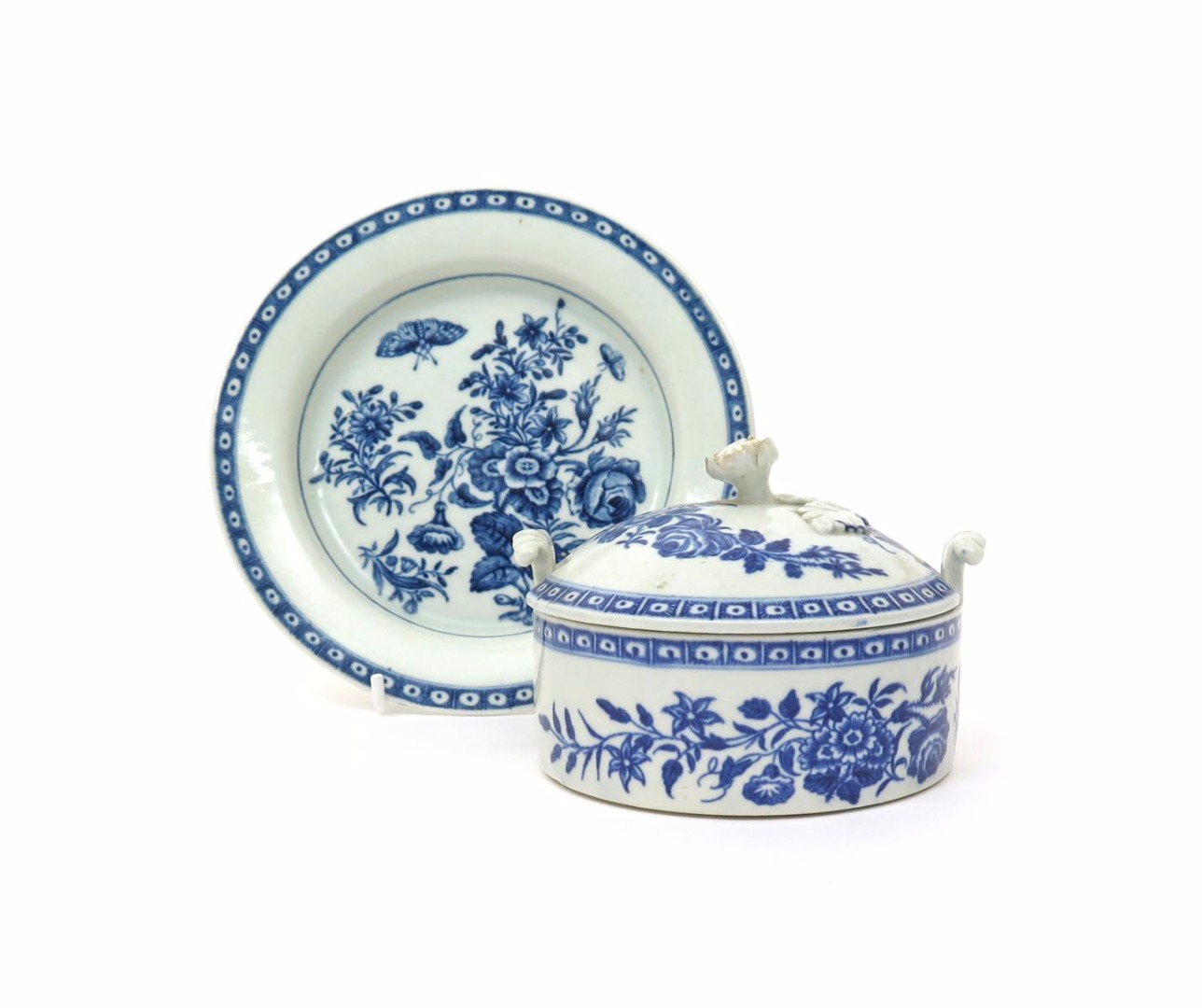 A Worcester blue and white circular buttertub with cover and stand c.1775