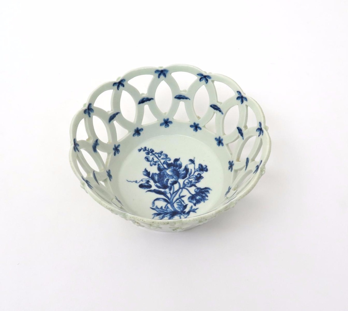 A rare Worcester blue and white basket c.1762, the circular form painted to the interior with the Anemone and Bellflower Spray pattern, the interior walls with bands of flowerheads and leaves, the exterior applied with flowerheads, open crescent mark, a short rim crack, 16.7cm dia.