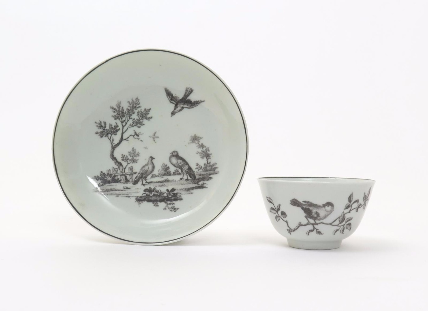 A Worcester teabowl and saucer c.1760, printed in black with ornithological designs, the teabowl with a finch perched on a branch, the saucer with a bird diving onto two others below, 12.2cm. (2)