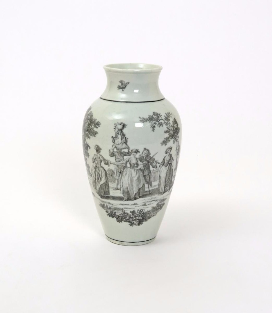 A Worcester ovoid vase c.1765, printed in black to one side with May Day, two ladies dancing to the music of a peg-legged fiddler, before a man balancing a bowl of flowers and other objects on his head, the reverse with a scene of Milkmaids, 20cm.