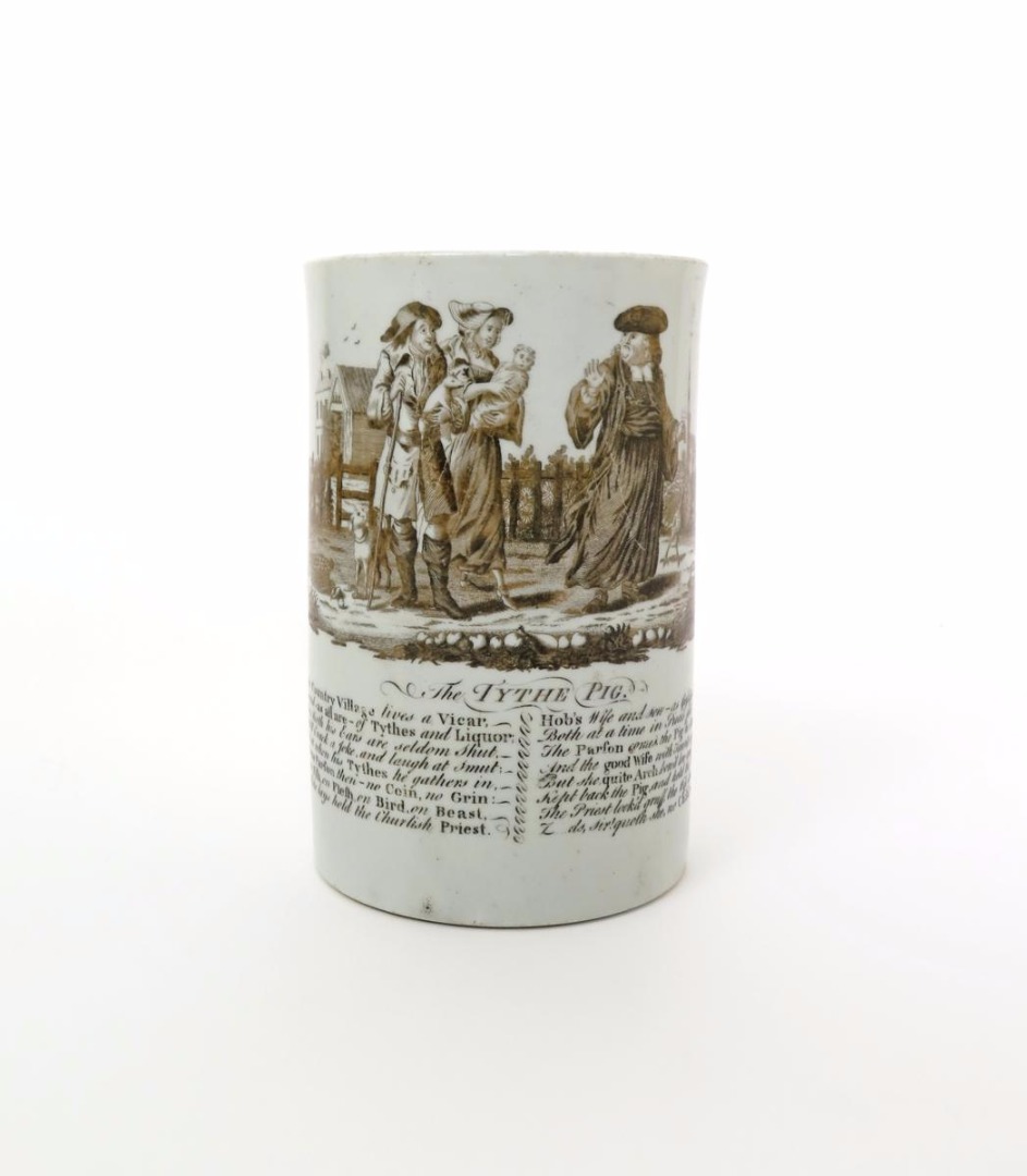 A large Richard Chaffers (Liverpool) mug c.1762-65, the tall cylindrical form printed in black with The Tythe Pig, a young couple offering the village clergyman a piglet and a baby before a farmstead, above a sixteen line verse telling the story behind the picture, a long crack, 16.5cm.