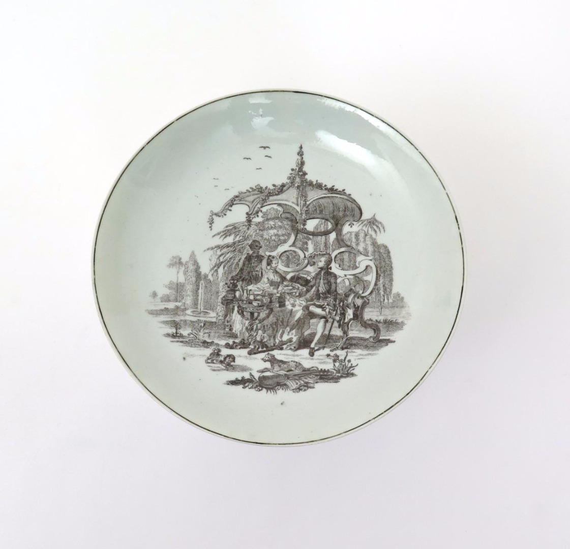 A rare Worcester saucer dish c.1760, printed in black with an unusual variation on the Tea Party design, a couple seated on an elaborate canopied bench with a servant standing in the shade behind, a small dog and a large cat in the foreground, 17cm.