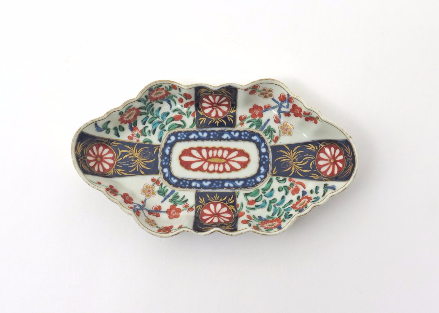 A rare Worcester hexagonal spoon tray c.1765, the elongated form brightly enamelled with a Japan pattern of Kakiemon floral panels alternating with chrysanthemum mons reserved on a dark blue ground, unusually moulded with a footrim rather than a flat base, square seal mark, 15.5cm.
