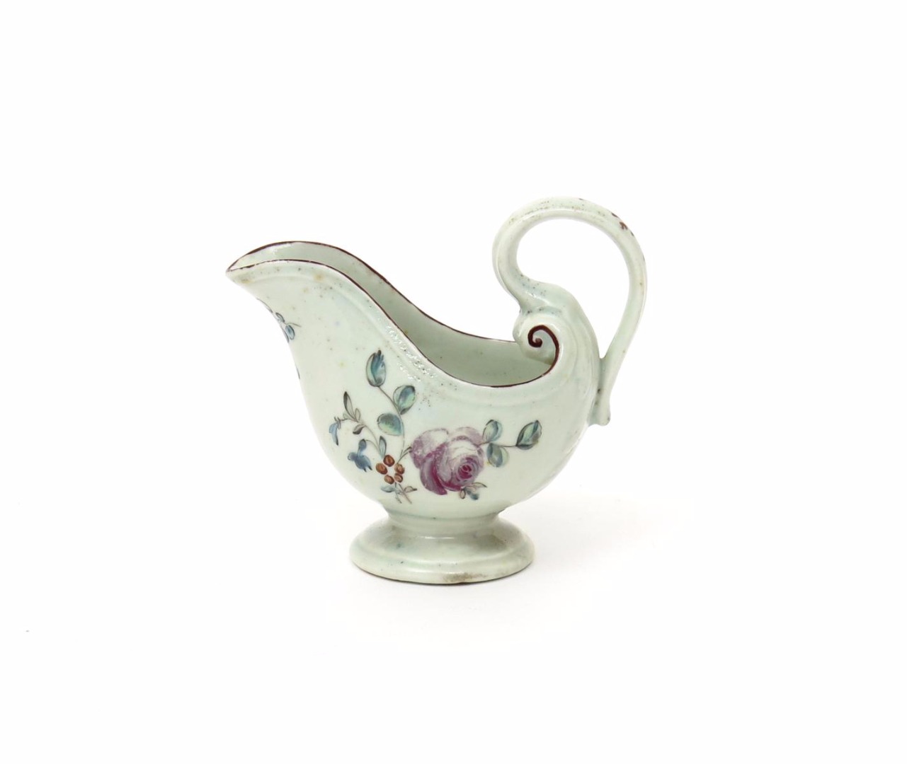 A Liverpool creamboat c.1765-70, probably Pennington's, of footed silver shape with a tall handle issuing from a moulded acanthus leaf, painted in a muted palette with sprays of rose and other European flowers, brown line rim, 9cm high.