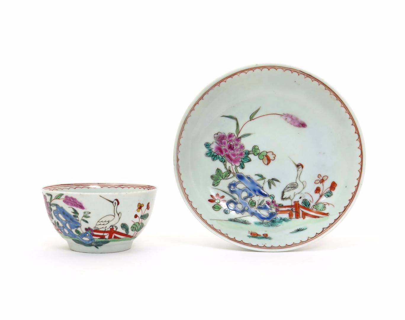 A Liverpool porcelain teabowl c.1760, probably Richard Chaffers, finely painted with a crane standing before a red fence beside flowering peony and blue rockwork, together with a Chinese porcelain saucer bearing the same pattern from which it derives, 11.8cm. (2)