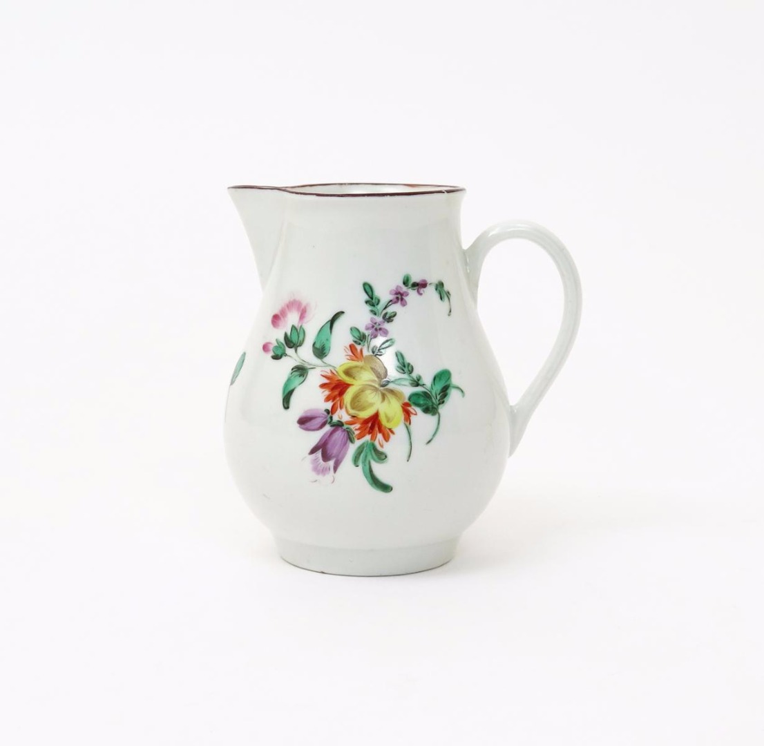 A small Bristol milk jug c.1770, painted in polychrome enamels with a flower spray and single scattered blooms, brown line rim, faint X and 9 mark to the base, 8.5cm.