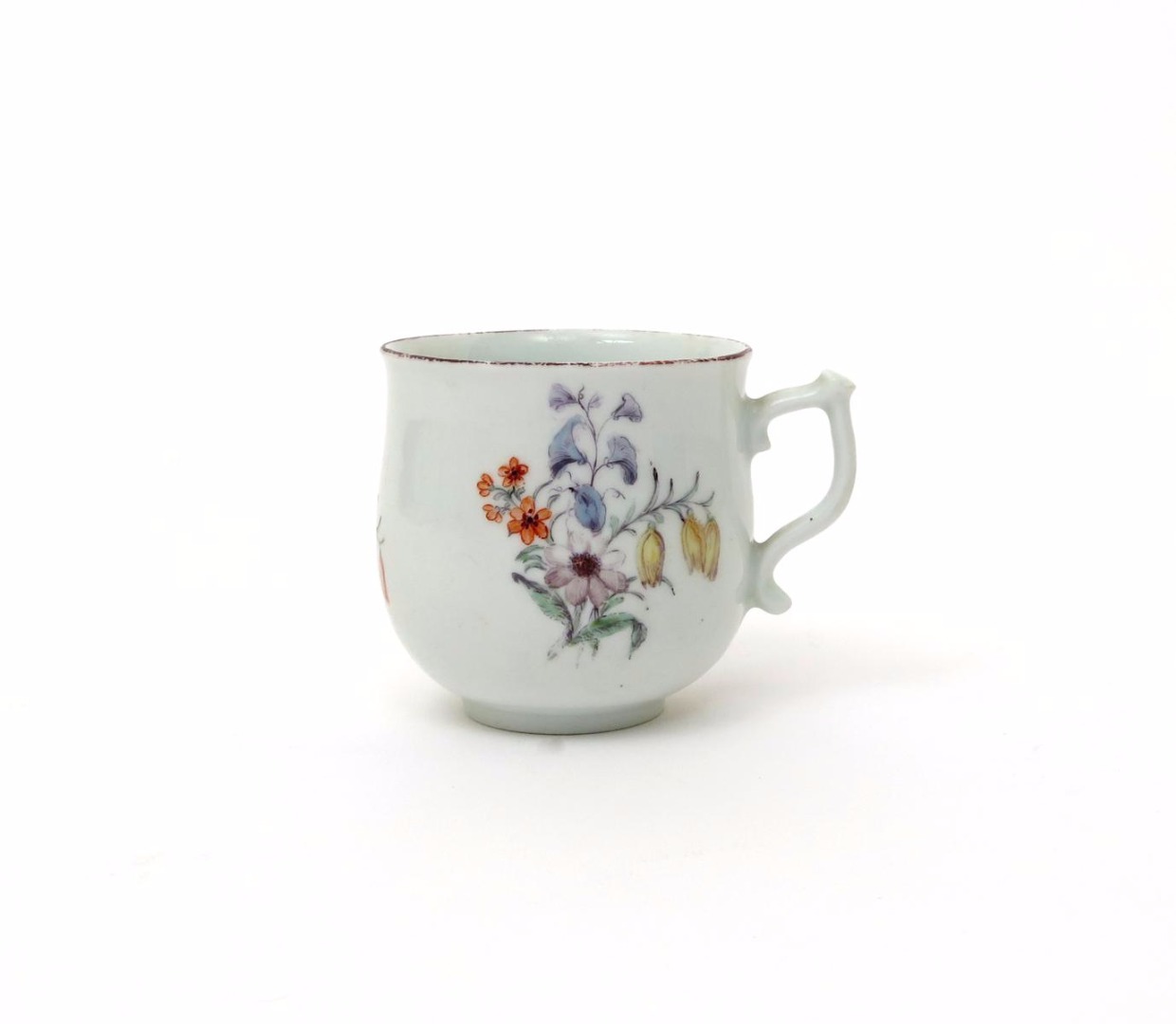A Chelsea bell-shaped cup c.1755, finely painted with sprays of English flowers including heartsease and convolvulus, with an unusual wishbone handle with flattened thumbrest, red anchor mark, some wear to the brown line rim, 6.5cm.