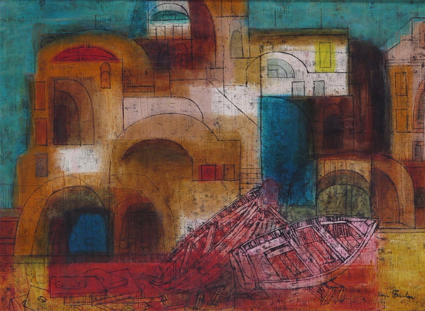 ‡Eva Fischer (b.1920) Boats on a hard with a classical town beyond