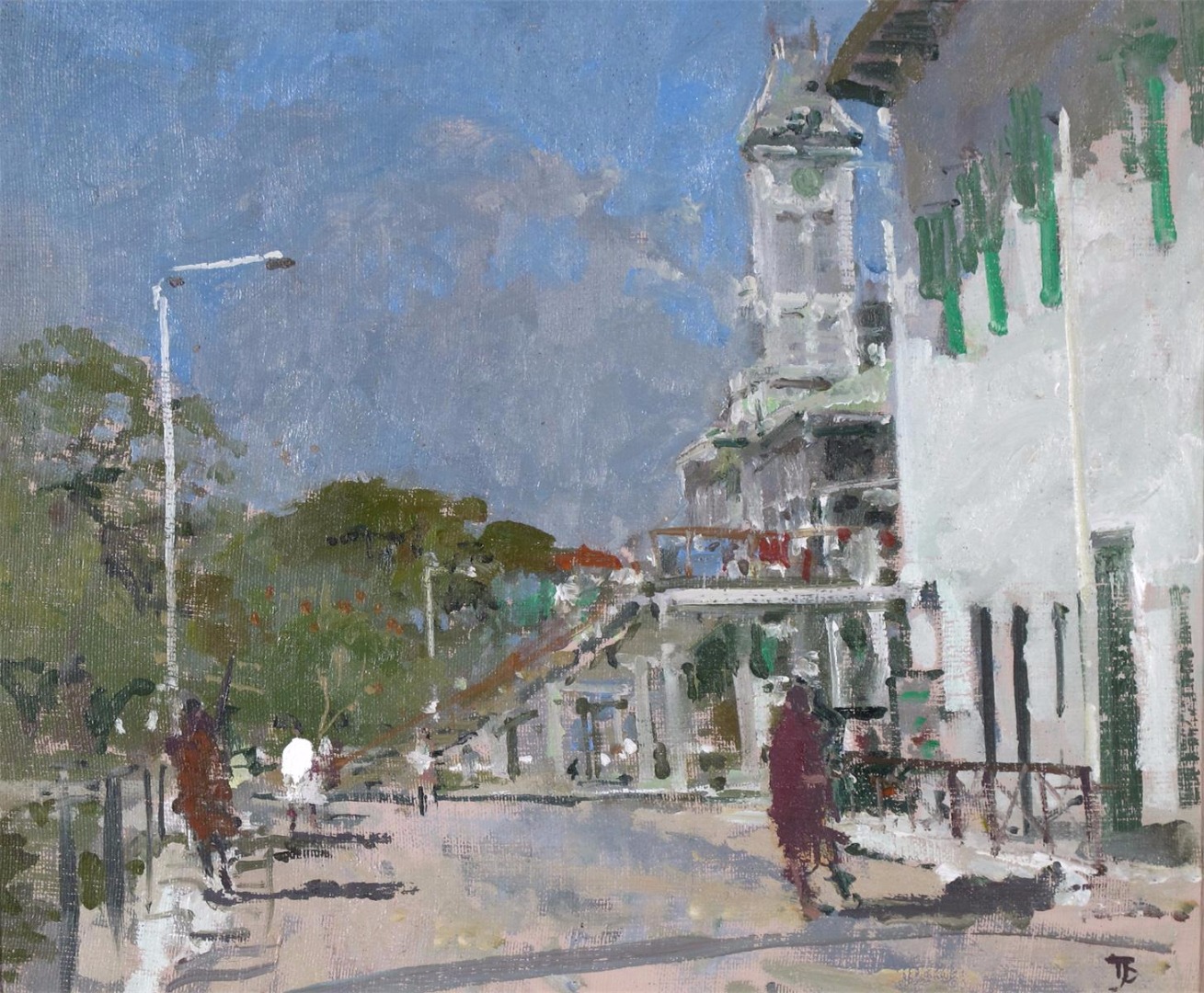 ‡Tom Coates R.W.S. (b.1941) A street scene in Zanzibar Signed with initials Oil on canvasboard 25...
