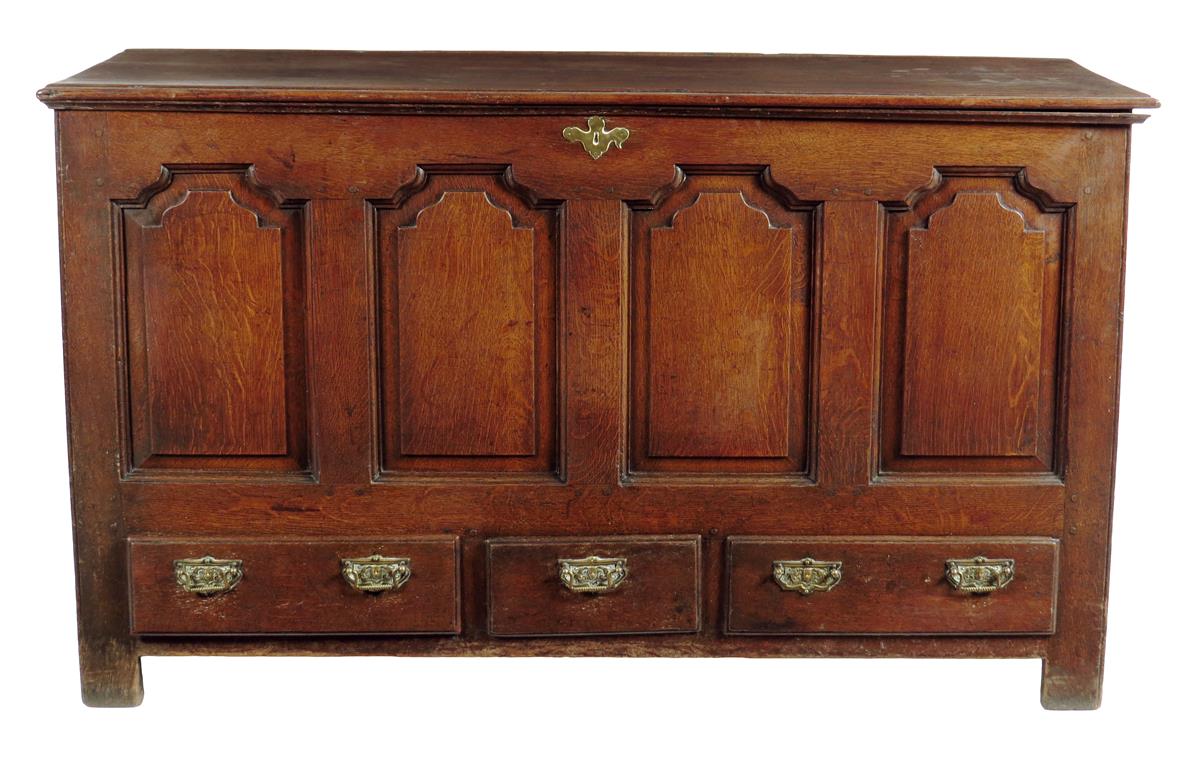 A George II oak mule chest, the boarded hinged top revealing a lidded till and with two drawers, the front with quadruple fielded panels above three base drawers, 84.8cm high, 146.2cm wide, 56.2cm deep.