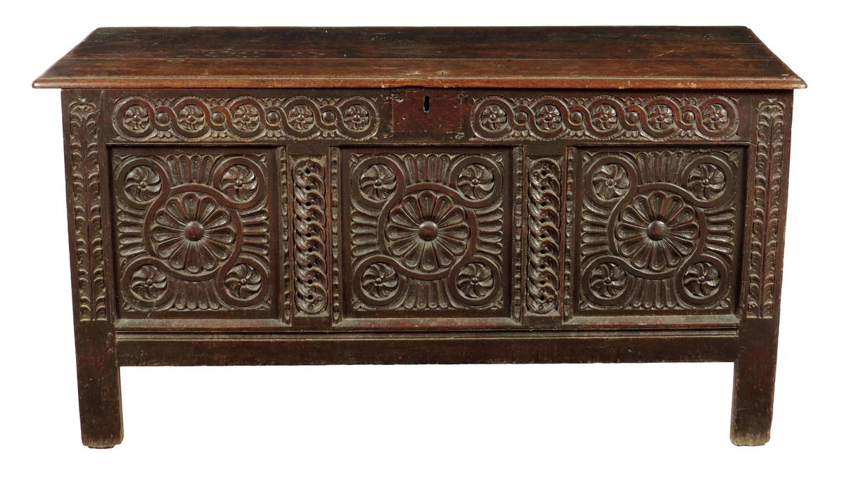 A Charles II oak coffer, the boarded later hinged top incised with initials, revealing a till, with a triple panelled front carved with flowerheads and a guilloche frieze, 72.5cm high, 140cm wide, 56.3cm deep.