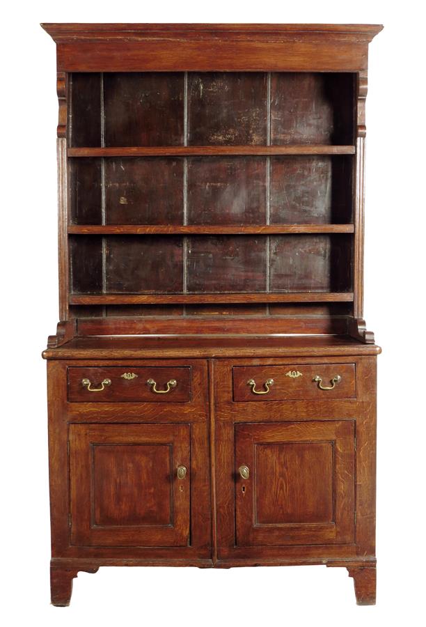 An oak dresser, the boarded plate rack with three shelves above a pair of frieze drawers and panelled drawers enclosing a shelf, George III but reduced in width, 204.6cm high, 122cm wide, 47.5cm deep.