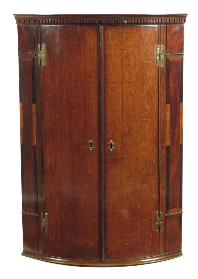 A George III oak bowfront hanging corner cupboard, with mahogany panels and specimen wood banding, with a pair of doors enclosing two shelves, 98.8cm high, 68.1cm wide, 46.7cm deep.