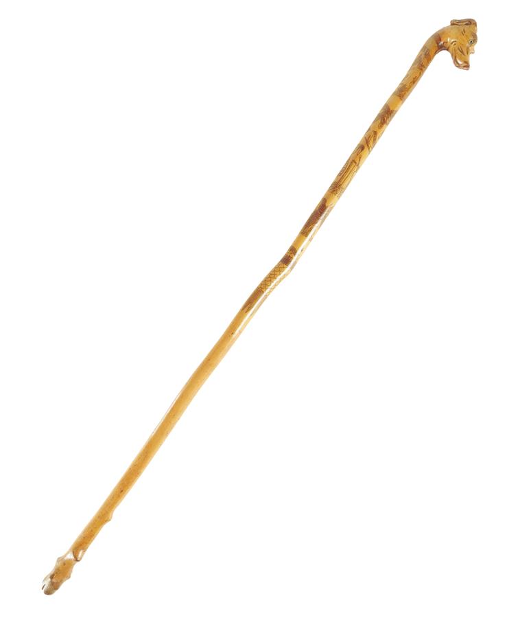 A Victorian boxwood swagger stick or riding crop, the greyhound head handle with glass eyes, the shaft etched with a hare coursing scene, various birds, a cricket bat, stumps and a ball, inscribed 'H. RABAN' and dated 'April 1871', 72.9cm long.