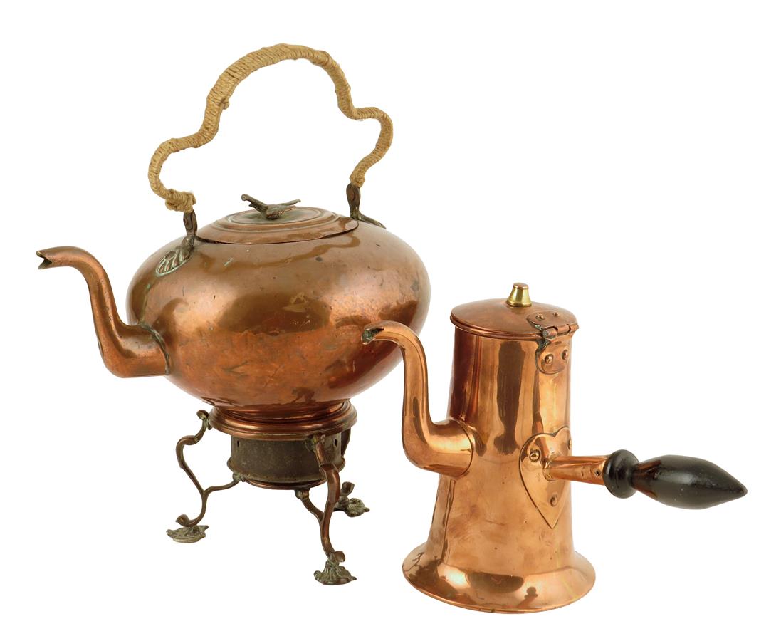 A George II copper kettle and stand, the lid with a bird handle, fitted with an iron heater, 24.2cm high, together with a copper coffee pot, with an ebonized handle. (2)