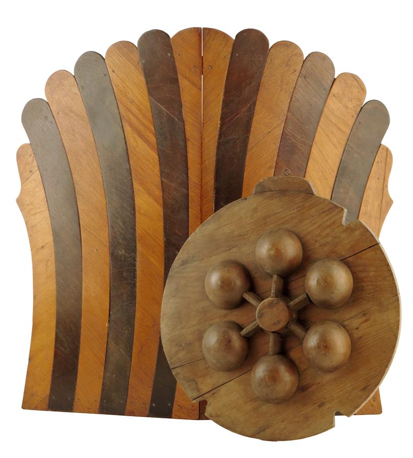 A 19th century treen mould, the circular frame with six spheres, 35cm diameter, together with a fan shape folding firescreen, 55.5cm high. (2)