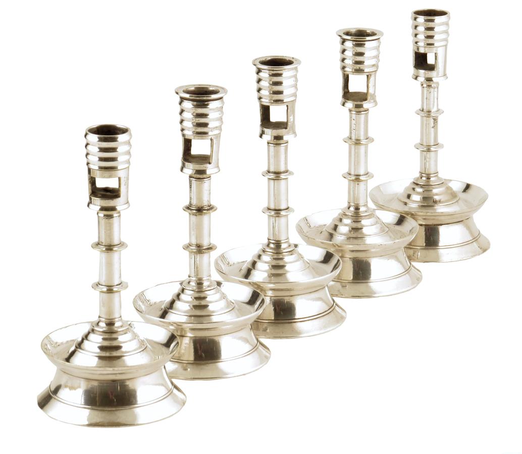 A set of five 19th century continental silvered brass candlesticks, each with an open knopped stem and a dished drip-pan domed foot, the underside stamped twice with indistinct marks, 17.5cm high. (5)