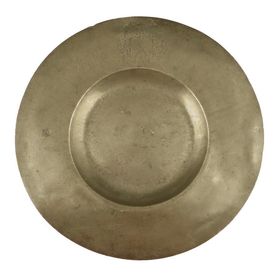 A 17th century continental pewter broadrim charger, engraved with an armorial with a bird on a rock, with two impressed marks, one with initials 'F R' and a stag head with two stars, the other with the date '1664' and 'D S C', 44.2cm diameter.