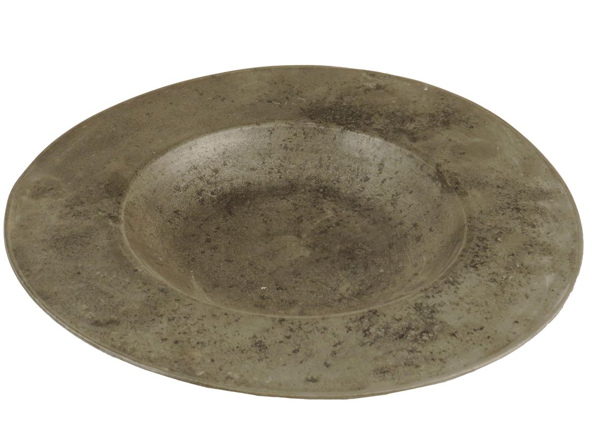 A 17th century pewter broadrim charger, the base with a rose and crown mark, 33.3cm diameter.