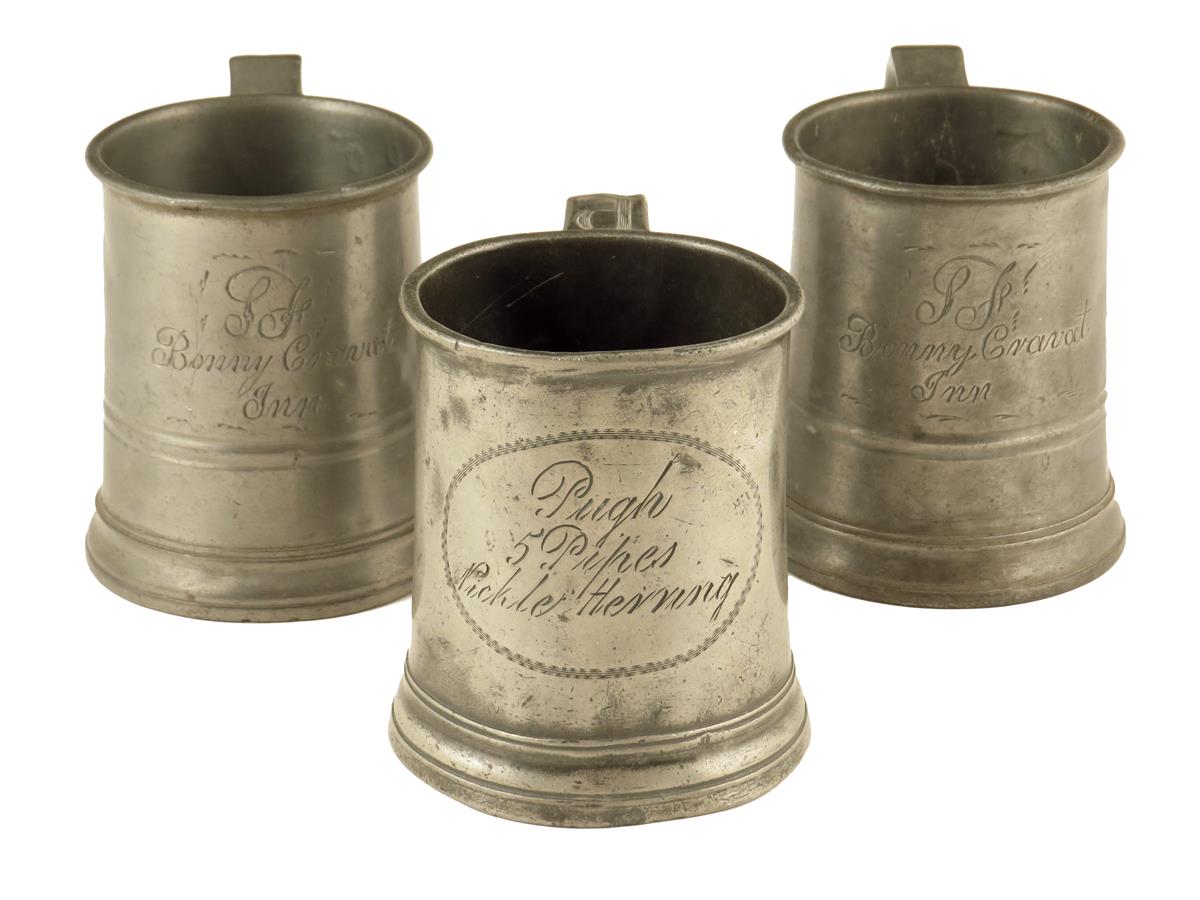 Two George III pewter pint tankards, engraved with initials 'J F' and 'Bonny Cravat Inn', 11.7cm high, together with another tankard inscribed 'Pugh 5 Pipes Pickle Herring'. (3)