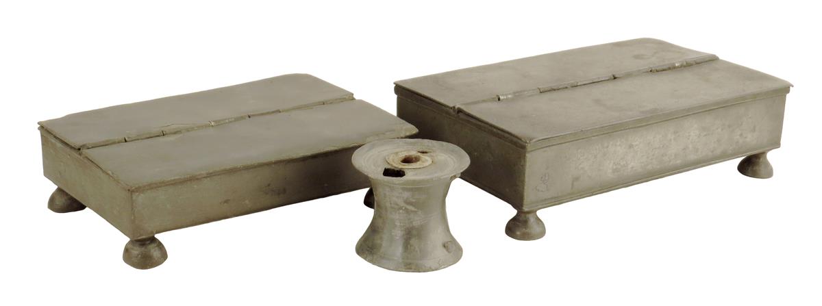 An 18th century pewter treasury inkstand, with hinged flaps revealing a pen compartment and two later glass inkwells, stamped with touchmark for Richard Going of Bristol, with 'X crown' and 'METAL' marks, the base with various rows of initials, 22.2cm wide, together with a similar inkstand and a pewter inkwell. (3)