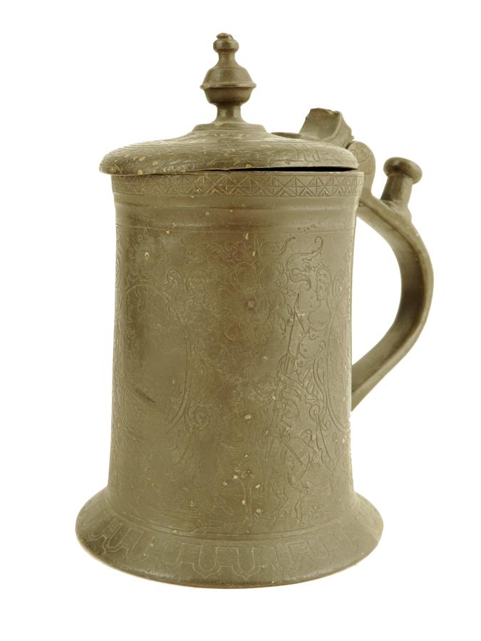 A continental pewter tankard, with engraved decoration of scrolling foliage with oval panels of figures, with caryatids, with figures fighting and a man on horseback, 16th / 17th century, the lid with three marks, 17.4cm high.