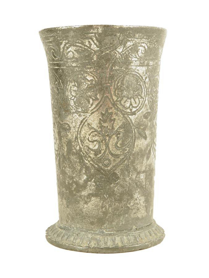A 17th century pewter wrigglework beaker, decorated with scrolling flowers and foliage, the base with a gadrooned rim, 11.2cm high.