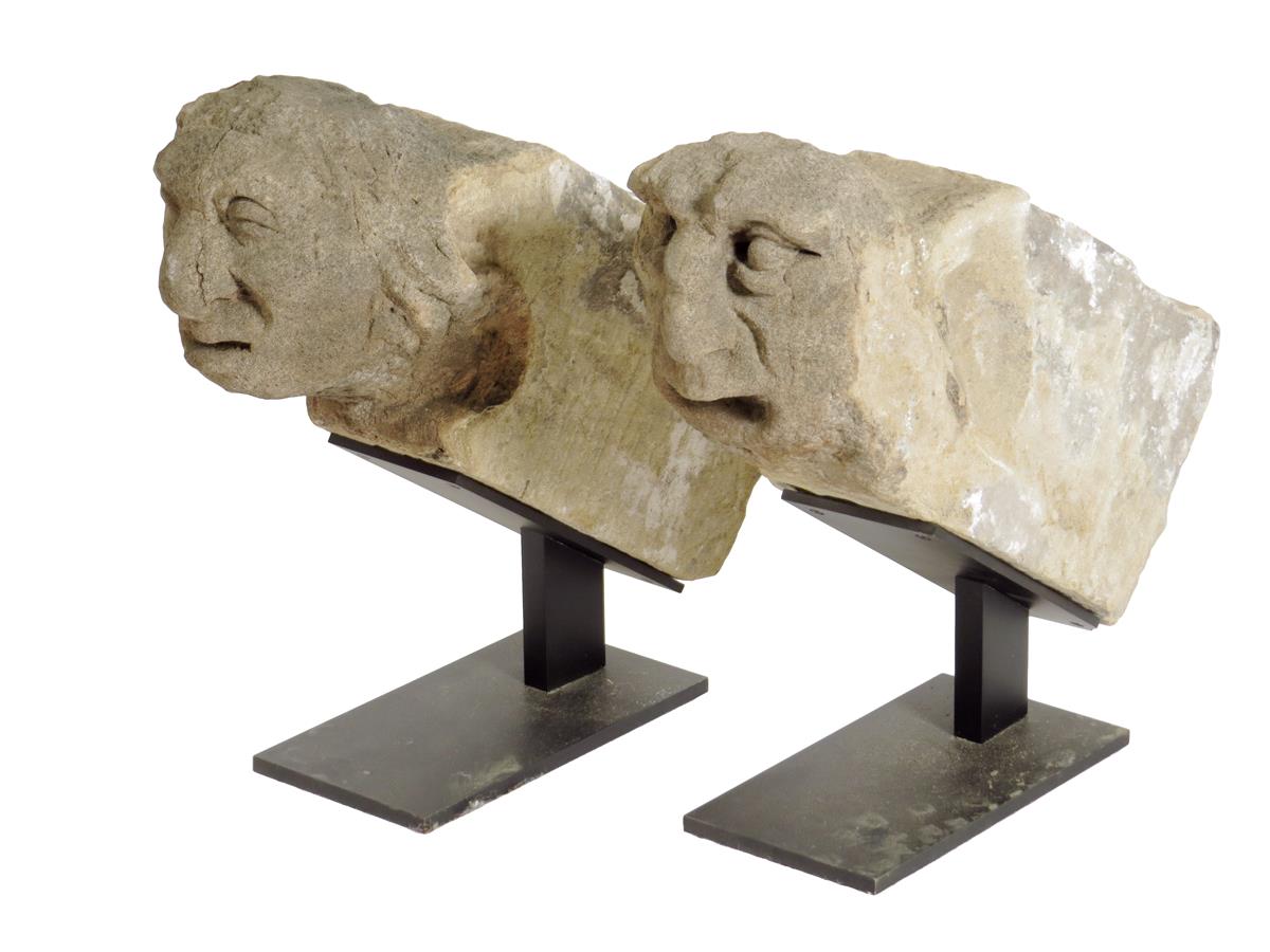 A pair of Medieval carved limestone corbels, carved with grotesque heads, 14th century, each mounted on a later plinth, 19cm high, 16.5cm wide, 50.5cm deep. (2)