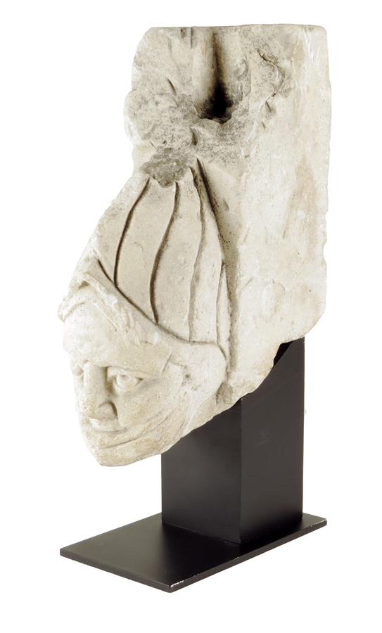 A Medieval carved limestone architectural fragment of a knight, wearing a helmet with his eyes raised to the heavens in prayer, possibly French 14th / 15th century, 29.8cm high, 12.5cm deep, mounted on a modern plinth.