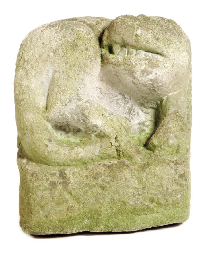 A carved limestone figure of a mythical recumbent beast