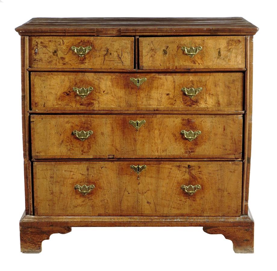 An early 18th century walnut and oak chest, of two short and three long crossbanded drawers, on bracket feet, 91.4cm high, 94.3cm wide, 56cm deep.