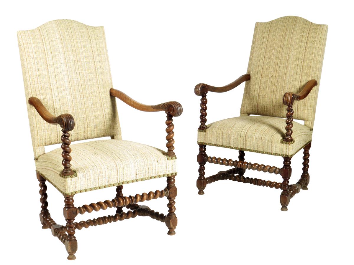 A pair of early 18th century style walnut open armchairs, each with an arch padded back and seat, with leaf carved scroll arms on spiral twist stretchered supports, late 19th century. (2)