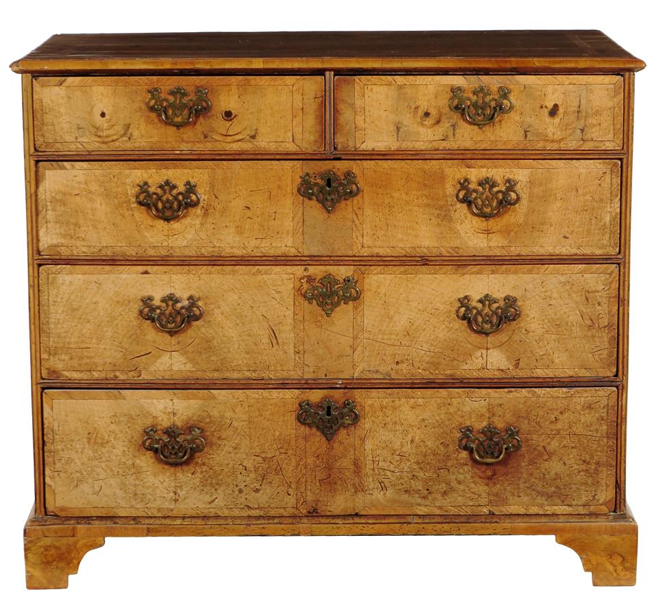 An early 18th century walnut chest, the crossbanded top above two short and three long drawers on later bracket feet, 82.4cm high, 95.3cm wide, 53cm deep.