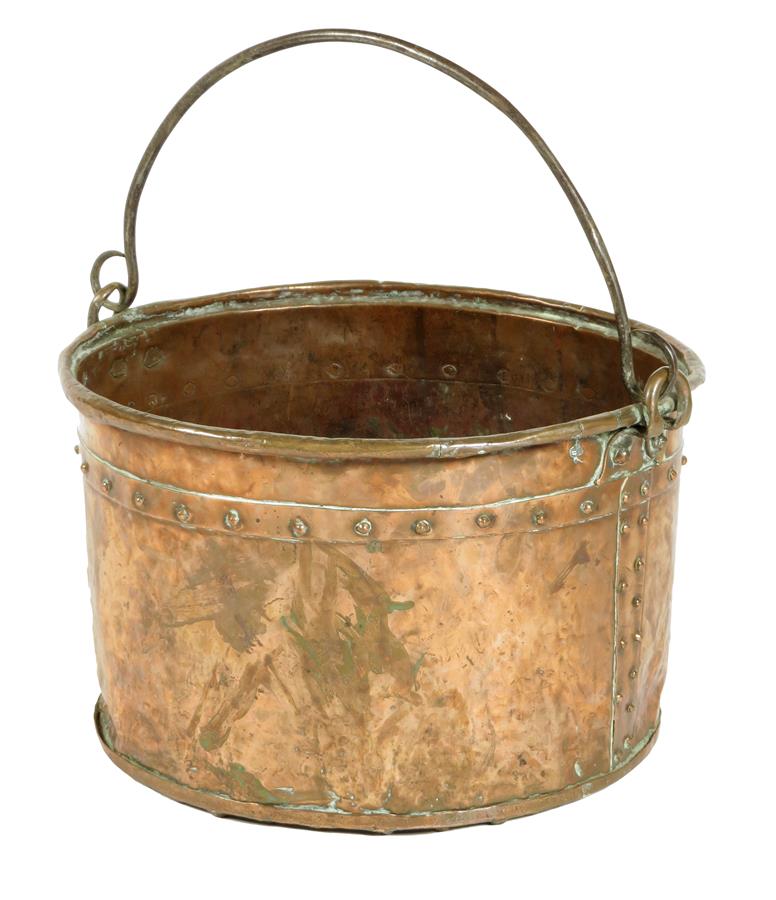 A 19th century Dutch copper log bin, with a swing handle and riveted body, 26.8cm high, 42cm diameter.