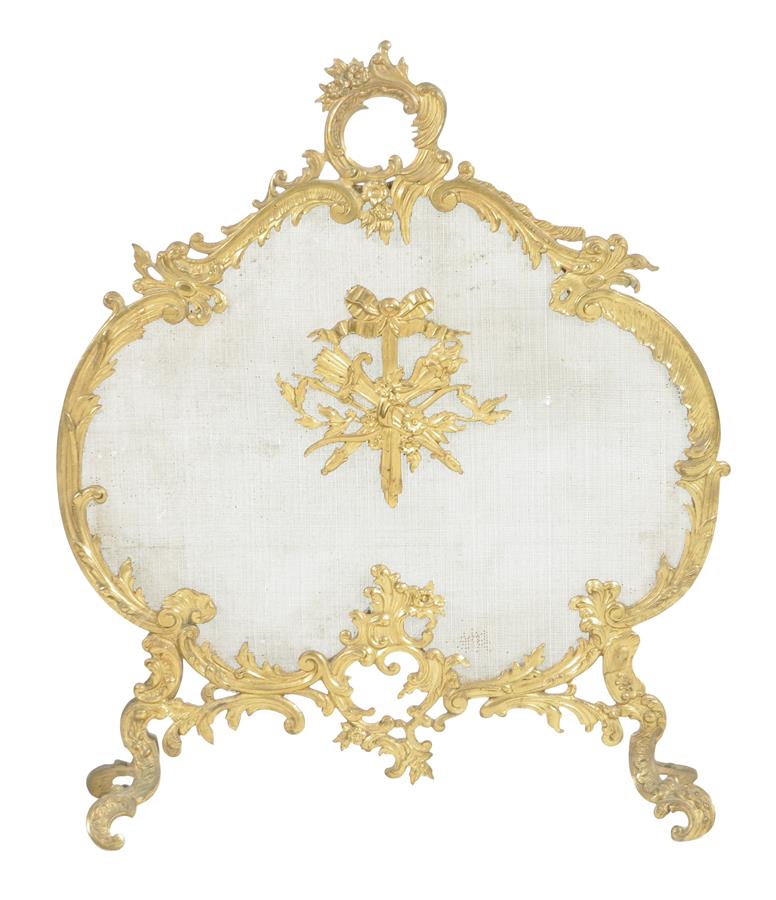 A late 19th century French gilt brass firescreen, in Rococo style, the mesh guard with applied ribbon tied war trophies, 78.5cm high, 67cm wide, 15.5cm deep.