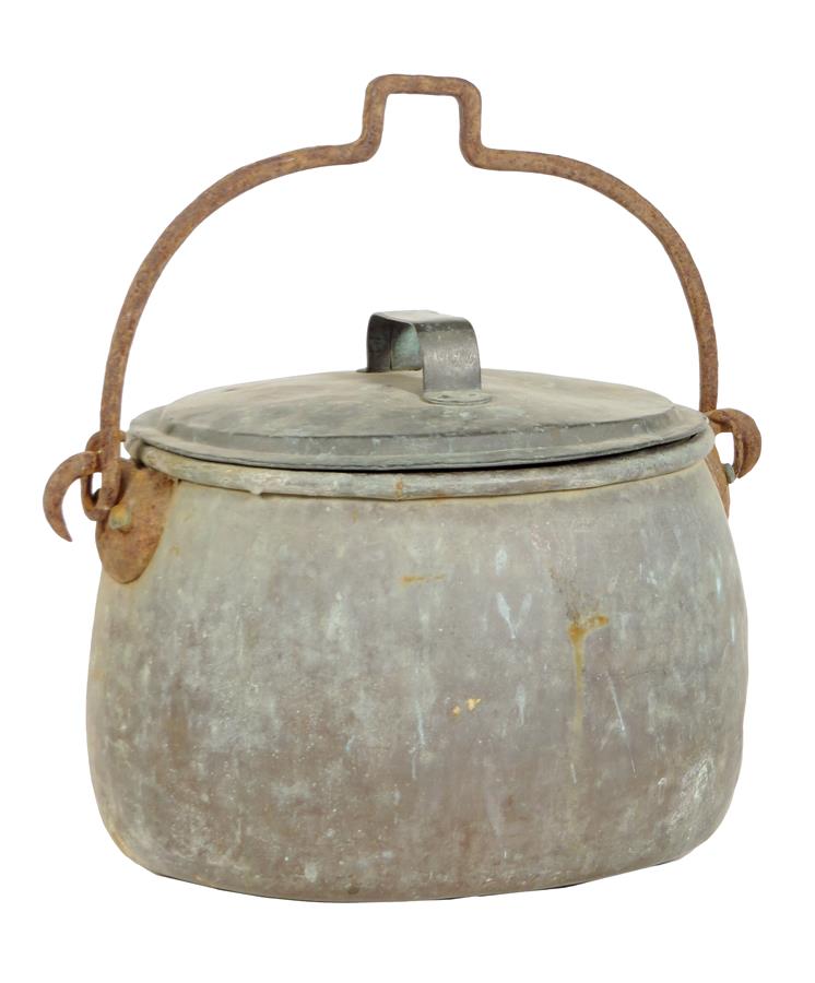 A large copper country house cooking pot and cover, with a swing handle, 31.4cm high, 34cm wide.