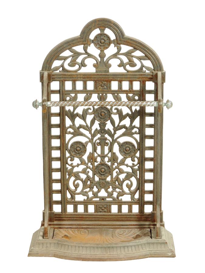 A Victorian cast iron stickstand in the manner of Dr. Christopher Dresser, the pierced back decorated with leaves and flowers above a lift-out drip-pan stamped 'No. 161087', 82cm high, 47.2cm wide, 26cm deep.