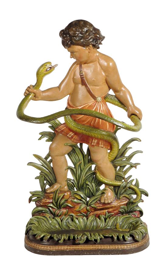 A Victorian and later painted cast iron umbrella stand, of the Infant Hercules wrestling with a snake, the design by Sheffield, Edwin & Theopilus Smith, with a lift-out drip-pan, 82cm high, 46.5cm wide, 26.5cm deep.