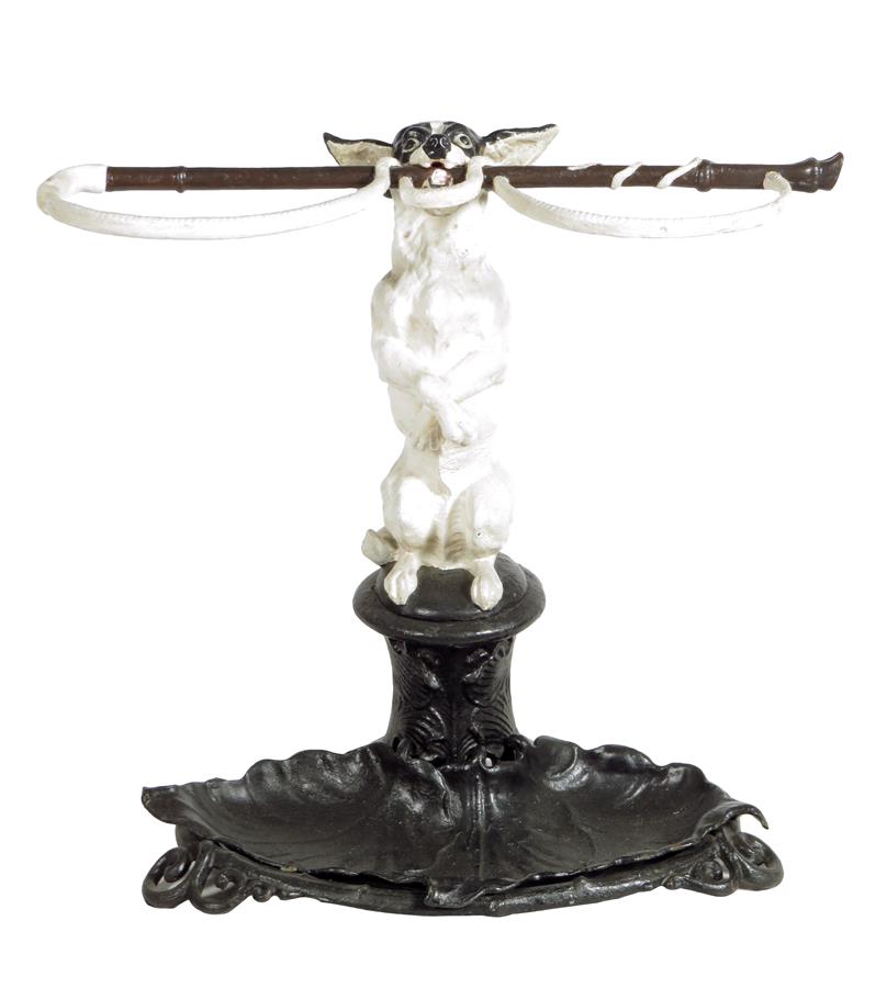 A Victorian novelty painted cast iron umbrella stand by Coalbrookdale, in the form of a chihuahua holding a riding whip in its mouth, the lift-out leaf shaped drip-pan stamped 'No. 85297' and with Victorian registration lozenge, 58.7cm high, 60.5cm wide, 36.3cm deep.