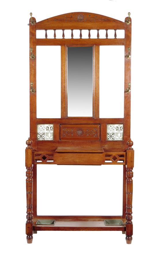A late Victorian mahogany hall stand, with a bevelled mirror and inset pottery tiles fitted with six gilt brass hooks above a hinged compartment, the base with two lift-out metal trays, 201.7 cm high, 91.5cm wide, 32cm deep.