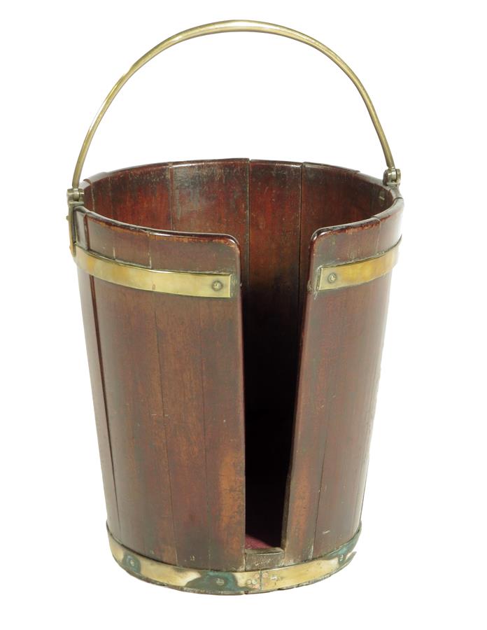 A late George III mahogany and brass bound plate bucket, with a swing handle, 44.5cm high, 39cm wide.