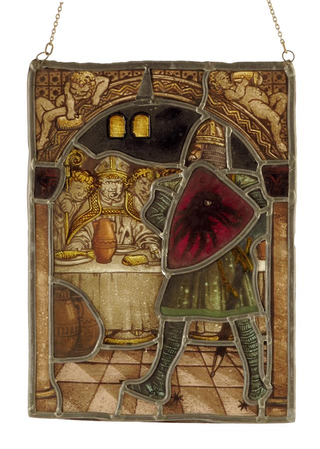 A German rectangular stained glass panel, depicting a Pope at a table with a loaf of bread and a fish with an attendant knight, late 19th / early 20th century, 27.3 x 20.3cm.