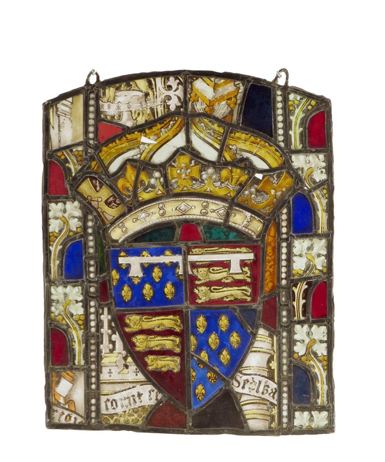 An armorial stained glass panel, decorated with the coat of arms of Edward the Black Prince, with Medieval fragments and later, 45.7 x 36.5cm.
