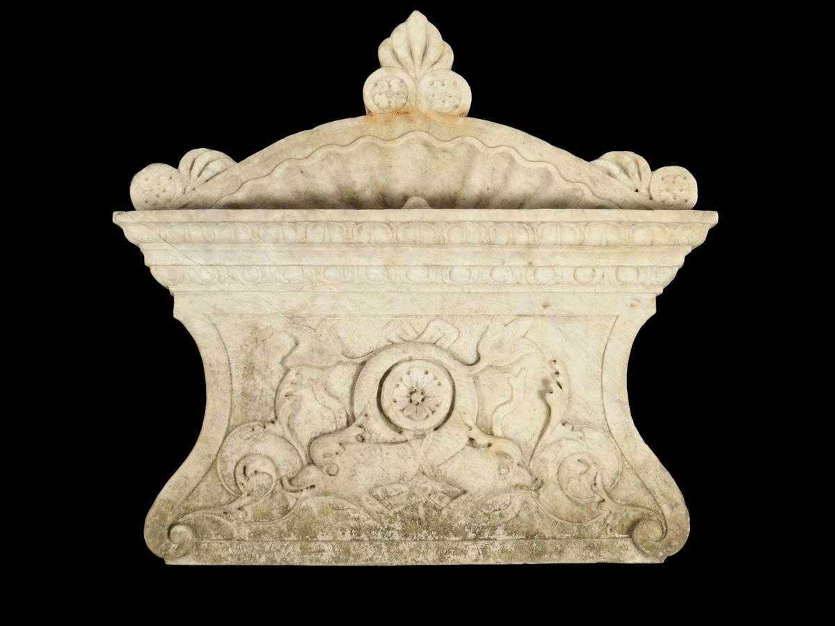 An Edwardian marble architectural fragment, the shell pediment decorated with anthemion motifs above a pair of entwined dolphins, 50.3cm high, 53.3cm wide.