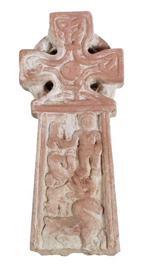 A carved red sandstone Celtic style cross, the stem decorated with figures, 47.8cm high, 19.4cm wide