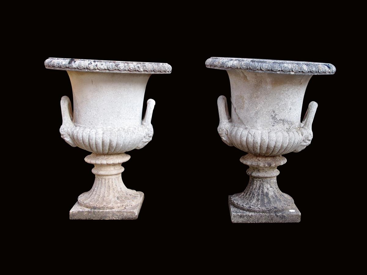 A pair of composition stone garden urns, of campana shape with a pair of handles with satyr masks, on a fluted socle, 72.5cm high, 60.5cm wide. (2)