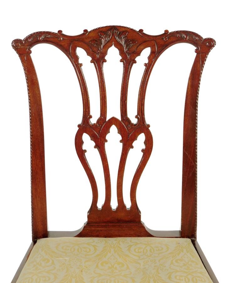 A George III mahogany side chair, the serpentine top rail carved with leaves and 'C' scrolls above a pierced Gothic splat and a drop-in seat.