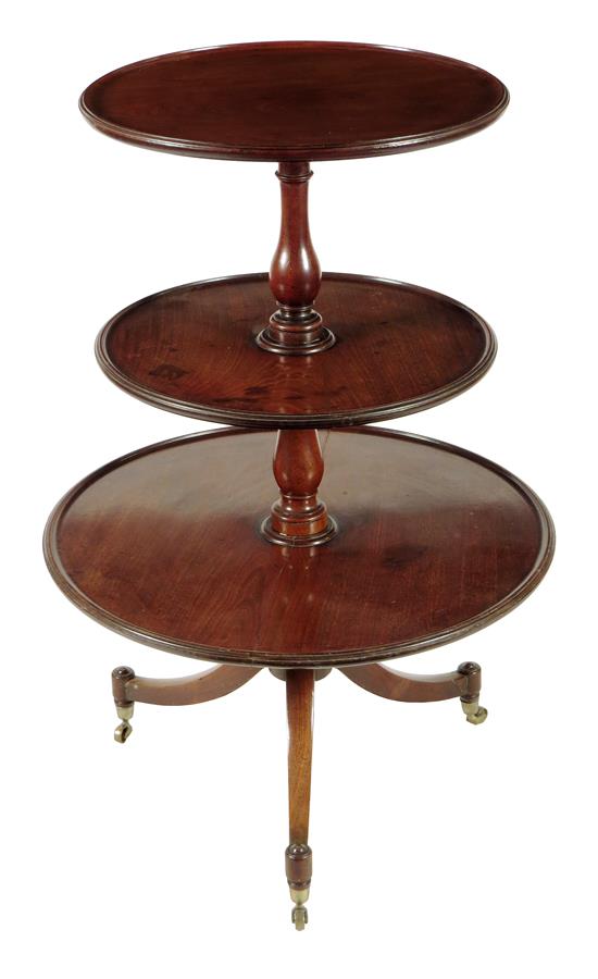A George III mahogany dumb waiter, with three revolving dished tiers, 108cm high, 74cm diameter.